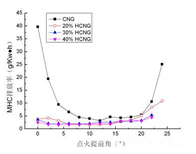 的MHC排放率明顯低于CNG燃料的MHC排放率,摻氫量越大,點(diǎn)火提前角越小,HCNG燃料的MHC排放率越低;