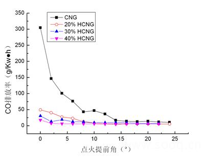 3.4.在非怠速條件下,因?yàn)楦變?nèi)高溫造成的還原反應(yīng)使HCNG燃料的CO排放率要高于CNG燃料,摻氫量越大,CO排放率越高。通過增加稀燃程度和推遲點(diǎn)火提前角來降低缸內(nèi)溫度的方法可以減少HCNG燃料的CO排放,在過量空氣為1.5的稀燃條件下,低點(diǎn)火提前角時(shí)摻氫量越大,CO排放率越??;