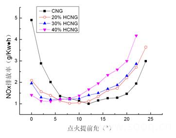 1983年Nagalingam等人針對(duì)點(diǎn)火提前角和排放關(guān)系,首先在AVL單缸機(jī)上從純天然氣、80/20、50/50、到純氫氣不同燃料進(jìn)行了研究。試驗(yàn)結(jié)果表明發(fā)動(dòng)機(jī)的最大功率較純甲烷為燃料時(shí)下降了23%,主要是由于氫氣的體積熱值低于甲烷的體積熱值。但是由于氫氣的燃燒速度很快,使得最佳點(diǎn)火提前角減小[1]。推遲點(diǎn)火提前角所帶來的火焰溫度下降對(duì)降低NOx十分有利[2]。