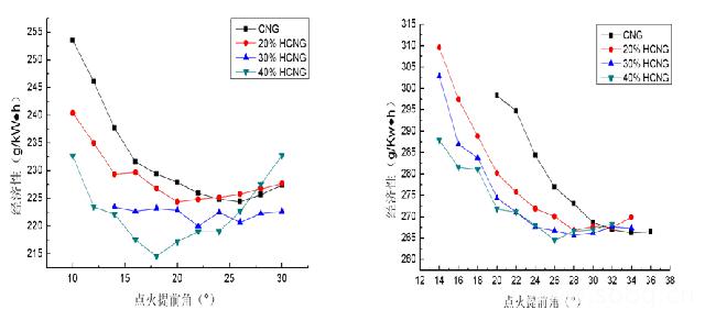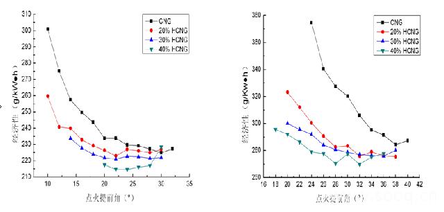 因?yàn)樵囼?yàn)時(shí)是采用不同燃料相同低熱值輸入的,所以動(dòng)力性越好的燃料經(jīng)濟(jì)性越好。圖7、圖8給出了燃料經(jīng)濟(jì)性比較情況,在計(jì)算HCNG燃料經(jīng)濟(jì)性時(shí)將氫氣的流量用等低熱值的方式換算成天然氣流量,再加到HCNG燃料中天然氣的流量上得出HCNG燃料的總流量的,而不是直接將氫氣的流量加上天然氣的流量得出HCNG燃料的總流量,這樣HCNG燃料就可以同CNG燃料比較經(jīng)濟(jì)性了。可以看出HCNG燃料摻氫量越大,經(jīng)濟(jì)性越好,經(jīng)濟(jì)性最好的點(diǎn)越靠近上止點(diǎn)。上述的試驗(yàn)中40%HCNG經(jīng)濟(jì)性最好的點(diǎn)要比同工況下CNG燃料節(jié)能5.07%。