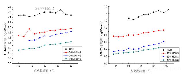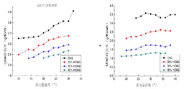 從圖9、圖10可知,HCNG燃料的MHC排放率要低于CNG燃料,摻氫量越大,HCNG燃料的MHC排放率越低,HCNG燃料的MHC排放都隨點(diǎn)火提前角的推遲而降低。CH4是一種化學(xué)穩(wěn)定性較強(qiáng)的氣體,通過后處理不易去除,所以使用HCNG燃料在CH4排放上有較大的優(yōu)勢(shì)。