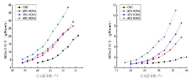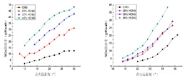 3.5. HCNG燃料的摻氫量越大, NOX排放率越高。HCNG燃料降低NOX排放率的有效方法是增加稀燃程度,推遲點(diǎn)火提前角;