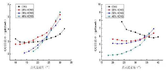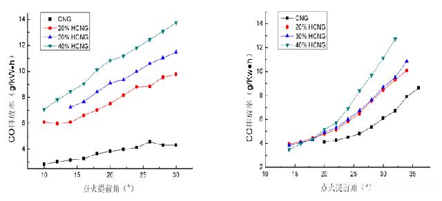 2006年黃佐華、汪金華等人在直噴發(fā)動(dòng)機(jī)上研究了混合比為95/5,90/10,82/18的HCNG燃料[8],其結(jié)論為點(diǎn)火提前角對(duì)HCNG直噴發(fā)動(dòng)機(jī)的性能影響極大,當(dāng)點(diǎn)火提前角增大時(shí)HC排放將降低,而NOx排放會(huì)升高,CO排放只有一些波動(dòng)。