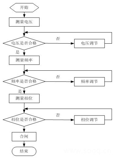 在電力系統(tǒng)的并列操作中,其核心是對并列條件的判斷,因此在對自動準(zhǔn)同期實(shí)驗裝置的設(shè)計中其重點(diǎn)也在于此[4]。其流程圖如圖1所示。