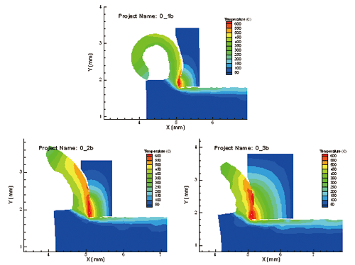 AdvantEdge FEM采用有限元法進行切削過程的物理仿真,作為切削條件輸入的內容包括:工件材料特性、刀具幾何、刀具材料特性、切削速度、冷卻液參數(shù)、刀具振動參數(shù)、切削參數(shù)等。軟件通過有限元分析后,獲得切削加工過程中的切削力、切屑打卷、切屑形成、切屑斷裂、熱流、刀具工件和切屑上的溫度分布、應力分布、應變分布、殘余應力分布等物理特性輸出結果。圖1所示為3種刀具的切削仿真及切削力比較;圖2所示為不同切削參數(shù)的切屑形成及溫度分布情況。