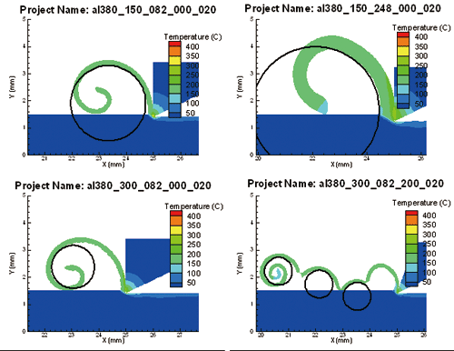 圖2 不同切削參數(shù)切屑形成及溫度分布