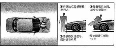 福特車上設(shè)計(jì)的一個彈身寸式發(fā)動機(jī)罩也具有AH功能,當(dāng)車與行人碰撞時,該罩會彈起幾英寸,對行人頭部形成柔性的折鄒帶進(jìn)行保護(hù)。