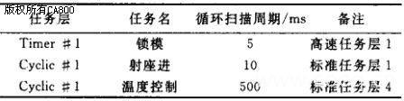 B&R 的PCC 控制器采用分時(shí)多任務(wù)操作系統(tǒng),具備大型計(jì)算機(jī)的分析能力。從注塑機(jī)控制要求出發(fā),將鎖模、溫控等過程對實(shí)時(shí)要求不同的任務(wù)設(shè)置在循環(huán)時(shí)間不同的任務(wù)等級中(如表1)。