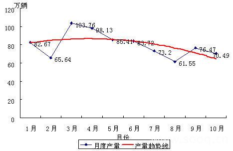 圖表1:08年1-10月份汽車產(chǎn)量趨勢(shì)圖