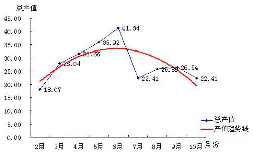 圖表2:08年2-10月份汽車零部件總產(chǎn)值趨勢(shì)圖