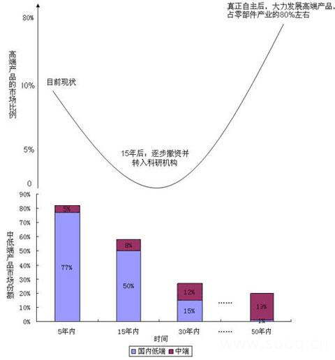 最后形成的發(fā)展藍(lán)圖就是:高端產(chǎn)品經(jīng)過(guò)厚積后迸發(fā),成為主導(dǎo)產(chǎn)品,剩余的市場(chǎng)份額是中端產(chǎn)品,而低端的產(chǎn)品向其他不發(fā)達(dá)地區(qū)和國(guó)家轉(zhuǎn)移。具體規(guī)劃可以用下圖表示: