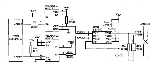 圖1 TMS320LF2407的CAN節(jié)點(diǎn)接口電路