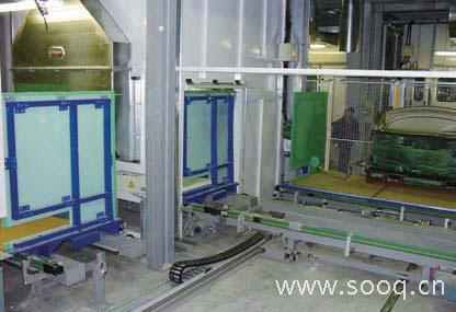模具首先進入IMC工位進行噴模內(nèi)漆,然后進入PU噴涂區(qū)域進行聚氨酯表皮噴涂成型。成型后得到的模具表面噴涂有PU層,并經(jīng)過接下來的工位進行熟化,最后進入操作工位后由人工取件。