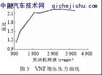 通過調(diào)節(jié)VNT(可變噴嘴環(huán)增壓器)噴嘴環(huán)截面可調(diào)節(jié)進(jìn)入渦輪的氣體狀態(tài)參數(shù),以使渦輪始終在高效率區(qū)工作,并達(dá)到與發(fā)動(dòng)機(jī)在各種工況下的最佳匹配(整個(gè)發(fā)動(dòng)機(jī)外特性工況的增壓壓力基本保持恒定)。VNT主要由VNT總成、真空調(diào)節(jié)閥、真空管路等組成。根據(jù)發(fā)動(dòng)機(jī)的運(yùn)行工況,由發(fā)動(dòng)機(jī)控制器ECU直接閉環(huán)控制VNT噴嘴環(huán)的開度,以保證發(fā)動(dòng)機(jī)的進(jìn)氣量要求。VNT的潤滑和冷卻,由從發(fā)動(dòng)機(jī)上引出的機(jī)油完成。典型的VNT增壓壓力特性如圖5所示。