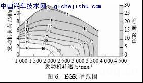 冷卻式廢氣再循環(huán)系統(tǒng)(EBR)由EGR閥、真空調(diào)節(jié)閥、廢氣冷卻器、廢氣管道、冷卻管路等組成,EGR的開度是根據(jù)ECU中標(biāo)定的控制脈譜來驅(qū)動(dòng)的。實(shí)機(jī)研究表明,采用EGR系統(tǒng)在某一發(fā)動(dòng)機(jī)工況,當(dāng)廢氣再循環(huán)率為15%時(shí),可以減少50%以上NOx排放,特別是采用改進(jìn)的EGR冷卻器后,可使NOx排放降低80%以上,同時(shí)減少了HCPM的排放。圖6EGR率曲線。