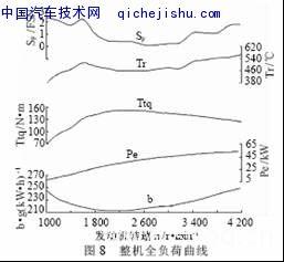 為了獲得良好的冷起動(dòng)性能,該機(jī)還配置了預(yù)熱塞輔助起動(dòng)系統(tǒng);為了以后升級(jí)到滿足歐Ⅳ排放,預(yù)留了微粒捕捉器、選擇性還原催化轉(zhuǎn)化器和氧化催化轉(zhuǎn)化器配置功能;采取了降低機(jī)油耗、油氣分離、液壓氣門間隙調(diào)節(jié)器等技術(shù)。圖8為該機(jī)動(dòng)力性水平曲線。