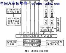 測(cè)試和記錄系統(tǒng)由磁帶記錄儀、動(dòng)態(tài)電阻應(yīng)變儀、穩(wěn)壓電源、信號(hào)發(fā)生器、二蹤示波器、壓力傳感器及位移傳感器等組成。試驗(yàn)中通過儀器測(cè)取的參數(shù)為壓力、角位移和線位移。液壓缸的流量通過分別安裝在前左輪和后左輪的2個(gè)轉(zhuǎn)向缸上的位移傳感器的位移計(jì)算得出。測(cè)試系統(tǒng)的工作原理如圖3所示。