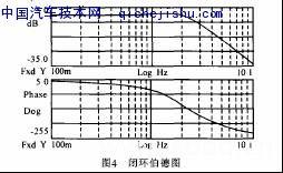 根據(jù)系統(tǒng)分析需要,本試驗(yàn)采集9個(gè)數(shù)據(jù):即系統(tǒng)的輸入信號(hào)(方向盤轉(zhuǎn)向角信號(hào))及輸出信號(hào)(4個(gè)霍爾效應(yīng)傳感器信號(hào)),這5個(gè)信號(hào)分別輸入1#磁帶記錄儀的1~5通道;另外,還在1#磁帶記錄儀的6、7通道分別記錄了工作壓力傳感器信號(hào)和負(fù)載壓力傳感器信號(hào);在2#磁帶記錄儀的1、2通道記錄了2個(gè)位移傳感器信號(hào),這2個(gè)位移傳感器分別安裝在左前輪和左后輪上,通過這2個(gè)位移傳感器信號(hào)可以計(jì)算出左前輪和左后輪轉(zhuǎn)向缸的流量。在試驗(yàn)中,為確保準(zhǔn)確性,每次都對(duì)各個(gè)傳感器進(jìn)行標(biāo)定。試驗(yàn)完畢后,在HP3562A動(dòng)態(tài)信號(hào)分析儀上對(duì)各個(gè)通道信號(hào)進(jìn)行分析、處理,并讀取數(shù)據(jù)。根據(jù)這些數(shù)據(jù),計(jì)算出各個(gè)頻率點(diǎn)上的輸出信號(hào)與輸入信號(hào)比值及相位差,從而可以得出系統(tǒng)的閉環(huán)伯德圖(如圖4)。