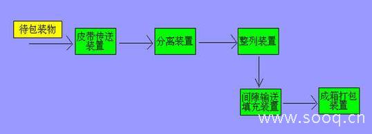 一臺(tái)自動(dòng)裝箱機(jī),包括:皮帶輸送裝置、分離裝置、整列裝置、間隙輸送填充裝置、成箱打包裝置,各裝置都安裝在同一主機(jī)架上。