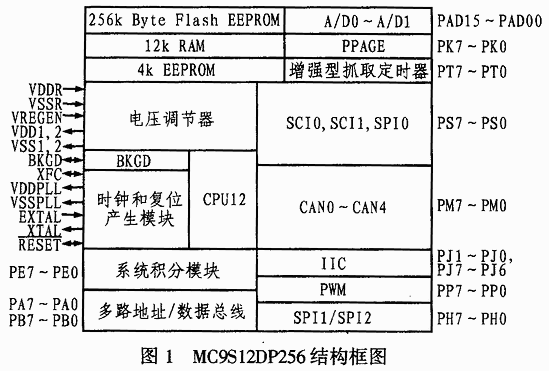 MC9S12DP256的主頻高達25MHz,同時片上還集成了許多標準模塊,包括2個異步串行通信口SCI、3個同步串行通信口SPI、8通道輸入捕捉/輸出比較定時器、2個10位8通道A/D轉換模塊、1個8通道脈寬調制模塊、49個獨立數(shù)字I/O口(其中20個具有外部中斷及喚醒功能)、兼容CAN2.0A/B協(xié)議的5個CAN模塊以及一個內部IC總線模塊;片內擁有256kB的FlashEEPROM12kB的RAM、4kB的EEPROM。圖1所示是其芯片結構框圖。