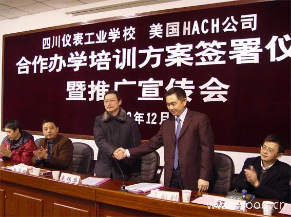 2008年12月15日,四川儀表工業(yè)學(xué)校與美國HACH公司合作辦學(xué)培訓(xùn)方案簽署儀式暨推廣宣傳會在座落于重慶市縉云山的四川儀表工業(yè)學(xué)校的報告廳隆重舉行。HACH公司在中國取得不斷發(fā)展的同時,更關(guān)注與支持中國環(huán)保教育事業(yè)的發(fā)展,為了促進中國環(huán)保中等職業(yè)教育的發(fā)展。在公司高層領(lǐng)導(dǎo)前期的親自過問與接觸下,HACH公司與四川工業(yè)儀表學(xué)校經(jīng)過多次溝通切磋,愉快順利地達成了合作辦學(xué)的協(xié)議。四川儀表學(xué)校從2009年初開始,每年在其二年級的學(xué)生中擇優(yōu)錄取學(xué)員開設(shè)水質(zhì)儀器培訓(xùn)班,這些學(xué)員將在學(xué)校進行為期1個學(xué)期的水質(zhì)分析儀器的培訓(xùn)與學(xué)習(xí),畢業(yè)后將服務(wù)于國內(nèi)水質(zhì)分析行業(yè)。HACH公司為該培訓(xùn)班提供教學(xué)技術(shù)協(xié)助,這也是HACH公司為中國環(huán)保教育做出的又一份貢獻。