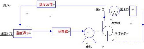 對(duì)于冷凍水系統(tǒng),由于低溫冷凍水溫度取決于蒸發(fā)器的運(yùn)行參數(shù)(一般冷凍水出水溫度為7℃),只需要控制高溫冷凍水(回水)的溫度,即可以控制溫差,現(xiàn)采用溫度傳感器、PID調(diào)節(jié)器、變頻器組成閉還控制系統(tǒng),冷凍水回水溫度控制在12℃,使冷凍水泵的轉(zhuǎn)速隨著負(fù)載熱負(fù)荷的變化而變化??刂圃硪?jiàn)下圖:
