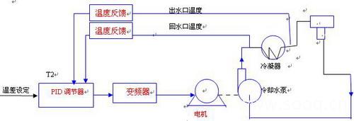 對(duì)于冷卻水系統(tǒng),取冷凝器兩側(cè)冷卻水的溫度作為控制參數(shù),采用溫度傳感器、PID調(diào)節(jié)器、變頻器、冷卻水泵組成閉還控制系統(tǒng),冷卻水溫差控制在T2,本系統(tǒng)為5℃,使冷卻水泵的轉(zhuǎn)速隨著負(fù)載熱負(fù)荷的變化而變化??刂圃硪?jiàn)下圖:
