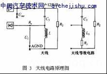鎖芯對(duì)天線線圈的電感量、磁通量都有很大影響;天線線圈的繞制對(duì)其質(zhì)量也有較大影響。天線線圈的電感量和諧振回路的電容應(yīng)達(dá)到諧振,才能得到足夠大的射頻發(fā)射信號(hào)。作者經(jīng)過(guò)大量的試驗(yàn),最終設(shè)計(jì)出結(jié)構(gòu)合理、性能穩(wěn)定的天線。天線的電路原理圖見(jiàn)圖3。