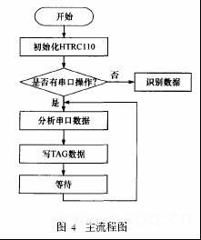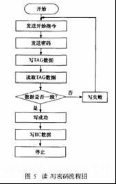 識(shí)別控制器軟件主要用于控制RF讀/寫專用芯片HTRC110通過(guò)無(wú)線方式對(duì)HITAGTM2密碼存儲(chǔ)器HT2DC20S20進(jìn)行讀/寫操作,從而實(shí)現(xiàn)密碼的識(shí)別和管理。該部分軟件包括串行通信、密碼識(shí)別、密碼讀寫以及執(zhí)行機(jī)構(gòu)控制。識(shí)別控制器軟件的主流程圖見(jiàn)圖4,讀/寫密碼流程圖見(jiàn)圖5。