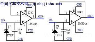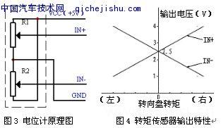 我們開發(fā)的電動(dòng)助力轉(zhuǎn)向系統(tǒng)應(yīng)用的是擺臂式的轉(zhuǎn)矩傳感器。其工作原理相當(dāng)于一個(gè)電位計(jì),如圖3所示,它具有雙回路輸出,即主扭矩(對(duì)應(yīng)IN 端電壓值)、副扭矩(對(duì)應(yīng)IN-端電壓值)輸出,其主、副扭矩輸出特性如圖4所示,即當(dāng)轉(zhuǎn)矩傳感器正常工作時(shí),電位計(jì)的兩個(gè)輸出即主扭和副扭信號(hào),理論上,正常工作范圍在1V~4V,并且當(dāng)轉(zhuǎn)向盤處于中間位置時(shí),轉(zhuǎn)矩傳感器的主扭和副扭的輸出電壓均為2.5V。一旦其本身及信號(hào)采集電路(如圖5)出現(xiàn)異常,輸入CPU(我們選用P87C591芯片為核心的8位微控制器,其本身自帶有A/D轉(zhuǎn)換器)的主、副扭矩信號(hào)將大于4V或小于1V或兩信號(hào)之差超過3V。但實(shí)際車輛行駛中,雖然硬件和軟件設(shè)計(jì)中考慮了各種抗干擾措施,各種偶爾的噪聲或振動(dòng)還是或多或少的會(huì)引起轉(zhuǎn)矩信號(hào)的暫時(shí)偏差,而這種偏離是暫時(shí)的且系統(tǒng)能自動(dòng)修復(fù),故將轉(zhuǎn)矩信號(hào)的異常界限值設(shè)為0.9V -4.1V,并且只有當(dāng)信號(hào)值超出其范圍持續(xù)一定時(shí)間(如30ms),才判定轉(zhuǎn)矩傳感器有故障,這樣可以減少因其它外界原因而引起對(duì)轉(zhuǎn)矩傳感器故障的誤判。