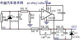 轉(zhuǎn)向助力大小是通過控制電機(jī)電流來實(shí)現(xiàn),因此檢測(cè)電機(jī)兩端的實(shí)際控制電流就顯得非常重要。電機(jī)電流采集電路(如圖6),通過測(cè)量串聯(lián)在驅(qū)動(dòng)回路中的精密電阻R62兩端的電壓,經(jīng)過信號(hào)放大和適當(dāng)?shù)碾娙轂V波,然后通過ADC2端口反饋給CPU,此時(shí)程序設(shè)計(jì)將此電壓與理論計(jì)算電壓進(jìn)行比較,如果兩者懸殊過大;或者連續(xù)幾分鐘之內(nèi)的平均電流消耗超過預(yù)先規(guī)定的數(shù)值,就判斷電機(jī)及其線路有故障,以防止電機(jī)過載而燒壞或工作不穩(wěn)定。其中我們選用的精密電阻值約7mΩ,這樣和電動(dòng)機(jī)電樞電阻168mΩ相比要小的多,因此基本不影響系統(tǒng)工作。