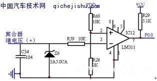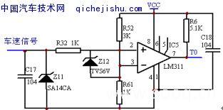 車速信號(hào)和發(fā)動(dòng)機(jī)轉(zhuǎn)速信號(hào)都是數(shù)字信號(hào),因此不需要經(jīng)過A/D轉(zhuǎn)換,只需經(jīng)過一定的整形電路,就可以直接送給CPU的定時(shí)器/計(jì)數(shù)器端口,然后通過計(jì)數(shù)器對(duì)波形的一定時(shí)間內(nèi)的計(jì)數(shù)即可采集車速和發(fā)動(dòng)機(jī)轉(zhuǎn)速。如車速整形電路(如圖7),車速信號(hào)通過一定的濾波和比較器比較,然后直接送給CPU的計(jì)數(shù)器T0。通過上述信號(hào)的采集,然后與相應(yīng)工況的規(guī)定值比較,即可以診斷如下故障: