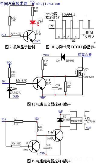 當(dāng)系統(tǒng)檢測(cè)到各組成部件出現(xiàn)上述異常之一,且持續(xù)時(shí)間超過相應(yīng)的規(guī)定值,程序設(shè)計(jì)就通過對(duì)P0.5端口間斷的置0或1,故障顯示控制電路(如圖9)就控制發(fā)光二極管(故障燈)閃爍,其中閃爍的次數(shù)和延續(xù)的時(shí)間(各種故障代碼)通過計(jì)數(shù)指針和延時(shí)子程序?qū)崿F(xiàn)。如主扭矩信號(hào)出現(xiàn)異常,指示燈將顯示故障代碼號(hào)DTC11,如圖10所示,亮1.5S,暗2S;再亮0.5S,暗3S,往復(fù)進(jìn)行,直至故障排除,稱“一長(zhǎng)一短”。 故障顯示的同時(shí),程序設(shè)計(jì)也對(duì)P0.4和P0.1端口分別置1和0,經(jīng)過電磁離合器控制電路(如圖11)和繼電器控制電路(如圖12)使得電磁離合器和繼電器同時(shí)被切斷,以確保電機(jī)助力完全被切斷,從而確保行車安全。