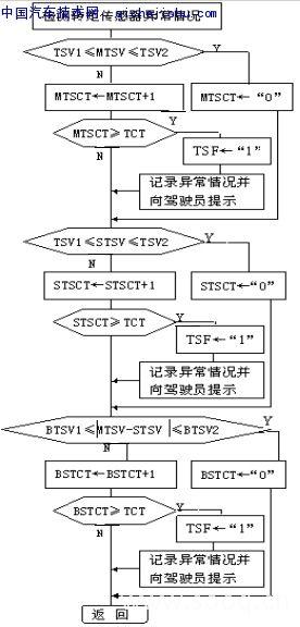此外,轉(zhuǎn)矩傳感器的信號(hào)檢測(cè)是建立在 5V的穩(wěn)壓電源基礎(chǔ)上的,因此穩(wěn)壓電源電路的正常與否將直接影響到主、副扭矩信號(hào)。因此在檢測(cè)轉(zhuǎn)矩傳感器主、副扭矩信號(hào)異常之前,首先判斷轉(zhuǎn)矩傳感器電源電壓是否在規(guī)定范圍內(nèi)。考慮到三端穩(wěn)壓集成塊MC78T05在環(huán)境溫度影響下其輸出電壓會(huì)有±0.1V的偏差,因此我們規(guī)定其正常輸出電壓為5±0.2V。如果CPU檢測(cè)到電源電壓異常,此時(shí)就跳過對(duì)轉(zhuǎn)矩傳感器信號(hào)的檢測(cè),這樣可以避免對(duì)轉(zhuǎn)矩傳感器本身故障的誤判。