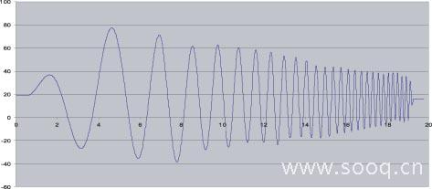 在正弦掃描試驗(yàn)中,隨頻率增加的正弦位移波形被應(yīng)用到方向盤上。理論上,車輛將沿著基本為直道的正弦路徑左右擺動(dòng)前進(jìn),實(shí)際上,如果路徑不夠平坦或者有風(fēng)在吹,車輛將會(huì)有偏移。司機(jī)可以通過(guò)操縱桿來(lái)糾正這種偏移,通過(guò)控制油門保持恒定的前進(jìn)速度。圖4所示為正弦掃描試驗(yàn)中方向盤轉(zhuǎn)角與時(shí)間的曲線。