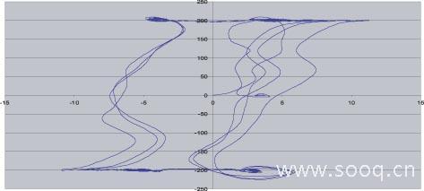 圖5所示為轉(zhuǎn)向作用力試驗(yàn)結(jié)果,由圖可見(jiàn),扭矩相對(duì)于方向盤轉(zhuǎn)速曲線的可重復(fù)性不是很好,而且車輛對(duì)于左轉(zhuǎn)或右轉(zhuǎn)的響應(yīng)是不對(duì)稱的。在這個(gè)項(xiàng)目中的試驗(yàn)環(huán)境并不完美,因?yàn)樵谠囼?yàn)道路上存在泥土或石頭。當(dāng)方向盤重復(fù)進(jìn)行轉(zhuǎn)彎操作時(shí),路面上會(huì)留有粘附輪胎的橡膠,因此,進(jìn)行這項(xiàng)試驗(yàn)時(shí)必須小心。隨著轉(zhuǎn)向周期數(shù)目的不斷增加,路面的摩擦系數(shù)可能改變。試驗(yàn)同樣可以在車輛的運(yùn)動(dòng)狀態(tài)中完成。
