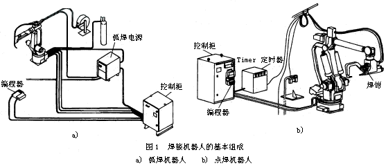 焊接機(jī)器人主要包括機(jī)器人和焊接設(shè)備兩部分。機(jī)器人由機(jī)器人本體和控制柜(硬件及軟件)組成。而焊接裝備,以弧焊及點(diǎn)焊為例,則由焊接電源,(包括其控制系統(tǒng))、送絲機(jī)(弧焊)、焊槍(鉗)等部分組成。對(duì)于智能機(jī)器人還應(yīng)有傳感系統(tǒng),如激光或攝像傳感器及其控制裝置等。圖1a、b表示弧焊機(jī)器人和點(diǎn)焊機(jī)器人的基本組成。