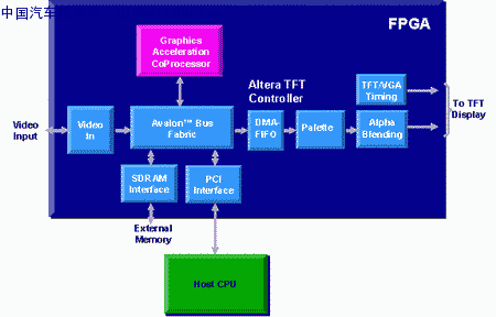 圖1 采用FPGA和主機(jī)處理器的汽車圖形控制系統(tǒng)