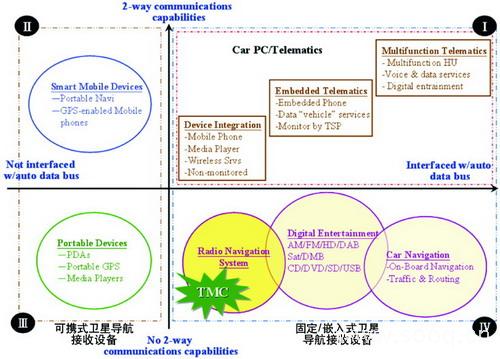 如圖1所示,第(I)類產(chǎn)品屬于嵌入式/固定式車用GPS,產(chǎn)品特色主要是以數(shù)字廣播、衛(wèi)星通訊與行動通訊等無線通訊技術(shù)與信息技術(shù),以汽車作為與外在環(huán)境資源如信息(衛(wèi)星定位、導(dǎo)航、追蹤、新聞、氣象與股市信息等)與多媒體(數(shù)字廣播、數(shù)字電視、在線游戲),進行單向或雙向的傳輸?shù)慕邮斩嗽O(shè)備,發(fā)展至今代表性系統(tǒng)產(chǎn)品為Telematics系統(tǒng);第(II)類產(chǎn)品屬于便攜式車用GPS,代表性產(chǎn)品為宇達電(Mio)的“Mio A700”與“Mio A701”以及ASUS所推出的“P535”,產(chǎn)品特色主要是整合手機、PDA 與GPS,同時具備行動通訊及GPS衛(wèi)星接收功能的產(chǎn)品;第(III)類產(chǎn)品屬于便攜式車用GPS,表性產(chǎn)品為宇達所推出“Mio169”與 “Mio269”、華碩推出的“A636”與“A632”以及由多普達推出的“P100”等產(chǎn)品,產(chǎn)品特色主要在于PDA整合GPS(包含主動式:采用藍牙、RS232或USB接收方式,以及被動式產(chǎn)品:PCMCIA、 CFIO、SDIO);第(Ⅳ)類產(chǎn)品屬于嵌入式/固定式車用GPS,代表性產(chǎn)品Panasonic的“CD-DV2300 DVD Navi System”、Alpine的“NVE-N077PS DVD Navi System”、Clarion的“NAX-9500E Hybrid Navi System”、Kenwood的“NV-D9032 DVD Navi System”以及Garmin的“StreetPilot III Deluxe”等,產(chǎn)品特色主要整合車用CD、DVD或廣播設(shè)備及GPS的產(chǎn)品。