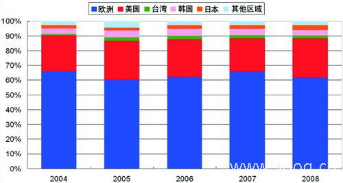 如圖8所示,全球PND出貨量隨著GPS手機出貨持續(xù)攀升,預(yù)估將由2004年的241萬臺成長至2010年的7,355萬臺,至于各市場出貨比重分布,隨著歐洲與北美市場PND市場逐漸趨于飽和,中國因舉辦2008年北京奧運及2010年上海世界博覽會,以及中國市場具備歐、美地域廣大及平均開車時間長等特性,整體PND出貨比重將由2004年北美及歐洲合計占70%至75%下滑至2010年70%以下,而亞太地區(qū)將因中國市場因素,由2004年的不到20%成長至2010年接近30%,可以預(yù)期亞太地區(qū)為未來GPS手機高速成長最大的市場區(qū)域,如圖8所示。