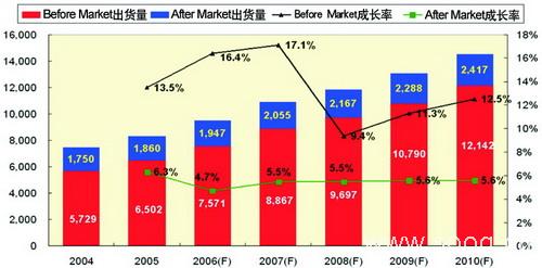 嵌入式/固定式車用GPS可分為Before Market(或稱Original Equipment,OE)與After Market,Before Market(BM)即一般所謂由原廠或銷售商預(yù)先安裝的原裝市場,After Market(AM)即所謂車輛售后由消費者自行購買并安裝的改裝或零售市場,根據(jù)IEK研究報告指出,2004年至2010年全球嵌入式/固定式車用 GPS系統(tǒng),隨著美國E-911與歐盟E-112政策激勵,BM/OE與AM出貨比重已由2004年以前的65%與35%改變成85%與15%左右,全球 BM/OE車用GPS出貨量將由2004年的572.9萬部套成長到2010年的1,214.2萬套,年復(fù)合成長率為12.5%,AM車用GPS出貨量方面,將由2004年的175萬臺成長至2010年的241.7萬臺,但在年復(fù)合成長率方面僅5.5%,如圖5所示。