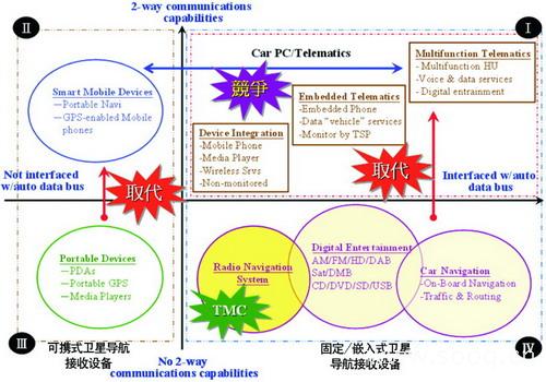 本文根據(jù)美國研究機構(gòu)Telematics Research Group以導(dǎo)航系統(tǒng)與汽車之間的相融度(Interfaced with auto data bus)與雙向通訊的能力(2-way communications capabilities)。