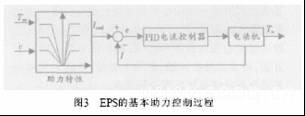 EPS的助力過程:控制器根據(jù)轉(zhuǎn)向盤轉(zhuǎn)矩傳感器的輸出Tsw和車速傳感器的輸出v,由助力特性確定電動(dòng)機(jī)的目標(biāo)電流Icmd,然后由電流控制器控制電動(dòng)機(jī)的電流I,使電動(dòng)機(jī)輸出目標(biāo)助力(矩)。因此,EPS的控制要解決兩個(gè)問題:一是確定電動(dòng)機(jī)的目標(biāo)電流;二是跟蹤目標(biāo)電流。其基本助力控制過程如圖3所示。電動(dòng)機(jī)的目標(biāo)電流是根據(jù)助力特性曲線確定的,在同一轉(zhuǎn)向盤力矩輸入下,電動(dòng)機(jī)的目標(biāo)電流隨車速的增加而降低,電流愈小則助力愈小,這樣能較好地兼顧輕便性與路感的要求。