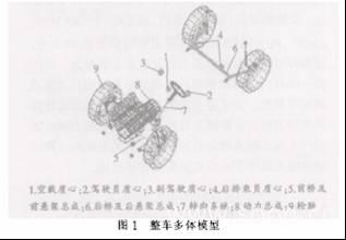 對(duì)其進(jìn)行性能仿真研究、建模及施加控制是兩大關(guān)鍵問題[2]。基于ADAMS軟件的虛擬樣機(jī)技術(shù),可把汽車視為一個(gè)由多個(gè)相互連接的、彼此能夠相對(duì)運(yùn)動(dòng)的多體系統(tǒng),其運(yùn)動(dòng)學(xué)及動(dòng)力學(xué)仿真與以往通常用幾個(gè)自由度的質(zhì)量—阻尼剛體(振動(dòng))數(shù)學(xué)模型相比,計(jì)算描述能夠更加真實(shí)地反映整車結(jié)構(gòu)和整車性能,也比其他方法更為直接方便[3]。