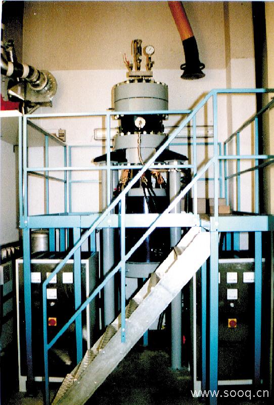 2) 真空設(shè)備包括變頻器、真空計(jì)、真空泵、智能控制儀表、真空控制器和密封設(shè)備等,真空計(jì)采集爐腔內(nèi)的真空度,真空控制器根據(jù)真空度變化調(diào)節(jié)變頻器頻率,進(jìn)而改變真空泵的運(yùn)行頻率,以保證爐腔內(nèi)的真空度穩(wěn)定;加溫設(shè)備包括中頻加熱爐、中頻電源、電流/電壓傳感器、可控硅和PID智能調(diào)節(jié)溫控儀表等,溫控儀表采集電流傳感器的模擬量信號(hào)(此值與爐內(nèi)溫度成線性關(guān)系),根據(jù)電流值和設(shè)定值進(jìn)行PID調(diào)節(jié),輸出給可控硅來(lái)調(diào)節(jié)中頻電源的電流,進(jìn)而保證爐內(nèi)溫度的穩(wěn)定;運(yùn)動(dòng)設(shè)備包括步進(jìn)電機(jī)、G3 PLC、絲杠、編碼器、限位開關(guān)和觸摸屏等,閉環(huán)調(diào)節(jié)籽晶桿和坩堝桿的運(yùn)動(dòng),調(diào)節(jié)坩堝自轉(zhuǎn),各種參數(shù)可以設(shè)置。生長(zhǎng)爐外型結(jié)構(gòu)見下圖: