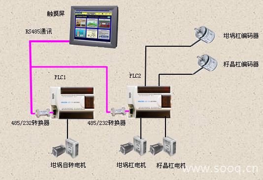 1) 系統(tǒng)采用觸摸屏與兩臺(tái)PLC通訊,控制三臺(tái)步進(jìn)電機(jī),其中兩臺(tái)步進(jìn)電機(jī)帶動(dòng)坩堝和籽晶桿平移,一臺(tái)為坩堝旋轉(zhuǎn)。平移兩軸需要使用編碼器反饋?zhàn)魅块]環(huán)控制和顯示。