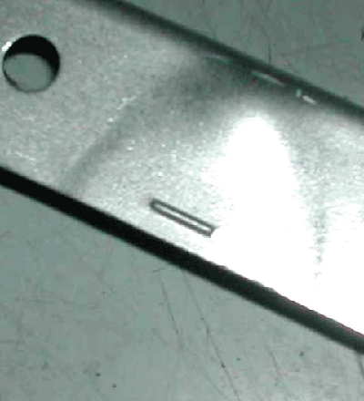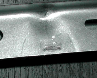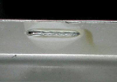 在轎車四門的結(jié)構(gòu)設(shè)計中,由于門內(nèi)板與門框件的連接在窗框內(nèi)側(cè)的切邊尺寸很窄(約為7mm),采用點焊工藝會有很大的困難,經(jīng)常造成半點焊、假焊或虛焊。所以在POLO車的該位置處采用了Arplas凸焊技術(shù),很好地解決了因為邊緣窄對焊點布置帶來的困難,并且焊點表面無焊痕,效果非常好(圖3、圖4)。