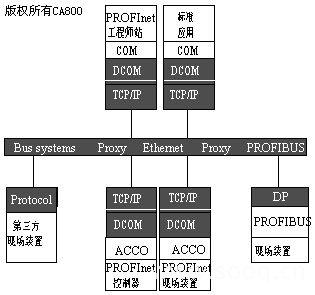 Profibus可以通過代理服務(wù)器(Proxy)很容易地實(shí)現(xiàn)與其它現(xiàn)場(chǎng)總線系統(tǒng)的集成,在該方案中,通過代理服務(wù)器將通用的Profibus網(wǎng)絡(luò)連接到工業(yè)以太網(wǎng);通過以太網(wǎng)TCP/IP訪問Profibus設(shè)備是由Proxy使用遠(yuǎn)方程序調(diào)用和Microsoft DCOM進(jìn)行處理的。