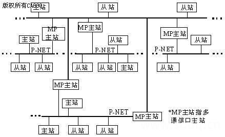 P-NET現(xiàn)場(chǎng)總線是一種多主站、多網(wǎng)絡(luò)系統(tǒng),圖4給出了P-NET系統(tǒng)的體系結(jié)構(gòu)??偩€采用分段結(jié)構(gòu),每個(gè)總線分段上可以連接多個(gè)主站,主站之間通過接口能夠?qū)崿F(xiàn)網(wǎng)上互連,它允許在幾個(gè)總線區(qū)直接尋址,無(wú)需遞階網(wǎng)絡(luò)結(jié)構(gòu)。該總線通信協(xié)議包括1、2、3、4和7層,并利用信道機(jī)構(gòu)定義用戶層。通信采用虛擬令牌(virtual token)傳遞方式,主站發(fā)送一個(gè)請(qǐng)求,被尋址的從站在390μs內(nèi)立即返回一個(gè)響應(yīng),只有存放到從站內(nèi)存中的數(shù)據(jù)才可被訪問。每個(gè)站節(jié)點(diǎn)都含有一個(gè)通用的單芯片微處理機(jī),配套的2KB EPROM不僅可用作通信,而且可用于測(cè)量、標(biāo)定、轉(zhuǎn)換和應(yīng)用功能。P-NET接口芯片執(zhí)行數(shù)據(jù)鏈路層的所有功能,第3層和第4層的功能由宿主處理器中的軟件解決。該總線物理層基于RS-485標(biāo)準(zhǔn),使用屏蔽雙絞線電纜,傳輸距離1.2km,應(yīng)用NRZ編碼異步傳輸。