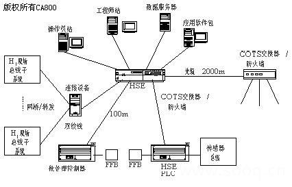 1998年,美國(guó)Fieldbus Foundation(FF)基金會(huì)決定采用高速以太網(wǎng)(High Speed Ethernet,HSE)技術(shù)開發(fā)H2現(xiàn)場(chǎng)總線,作為現(xiàn)場(chǎng)總線控制系統(tǒng)控制級(jí)以上通信網(wǎng)絡(luò)的主干網(wǎng),它與H1現(xiàn)場(chǎng)總線整合構(gòu)成信息集成開放的體系結(jié)構(gòu),圖5給出了系統(tǒng)結(jié)構(gòu)。HSE網(wǎng)絡(luò)遵循標(biāo)準(zhǔn)的以太網(wǎng)規(guī)范,并根據(jù)過程控制的需要適當(dāng)增加了一些功能,但這些增加的功能可以在標(biāo)準(zhǔn)的Ethernet結(jié)構(gòu)框架內(nèi)無(wú)縫地進(jìn)行操作,因而FF HSE總線可以使用當(dāng)前流行的商用(COTS)以太網(wǎng)設(shè)備。100Mbps以太網(wǎng)拓?fù)涫遣捎媒粨Q機(jī)形成星形連接,這種交換機(jī)具有防火墻功能,以阻斷特殊類型的信息出入網(wǎng)絡(luò)。HSE使用標(biāo)準(zhǔn)的IEEE802.3信號(hào)傳輸,標(biāo)準(zhǔn)的Ethernet接線和通信媒體。設(shè)備和交換機(jī)之間距離,使用雙絞線為100米,光纜可達(dá)2千米。HSE使用連接裝置(LD)連接H1子系統(tǒng),LD執(zhí)行網(wǎng)橋功能,它允許就地連在H1網(wǎng)絡(luò)上的各現(xiàn)場(chǎng)設(shè)備,以完成點(diǎn)對(duì)點(diǎn)對(duì)等通信。HSE支持冗余通信,網(wǎng)絡(luò)上的任何設(shè)備都能作冗余配置。